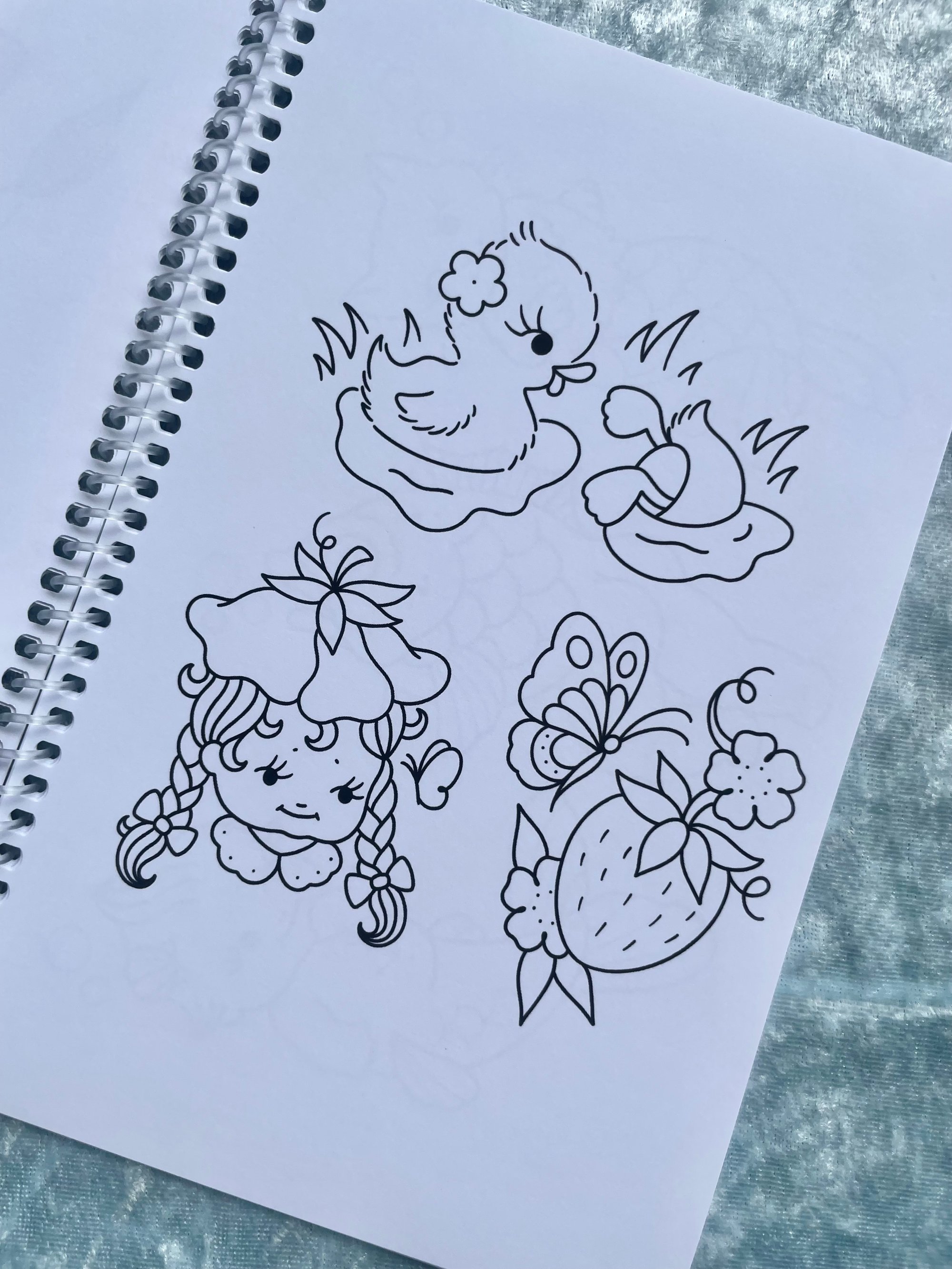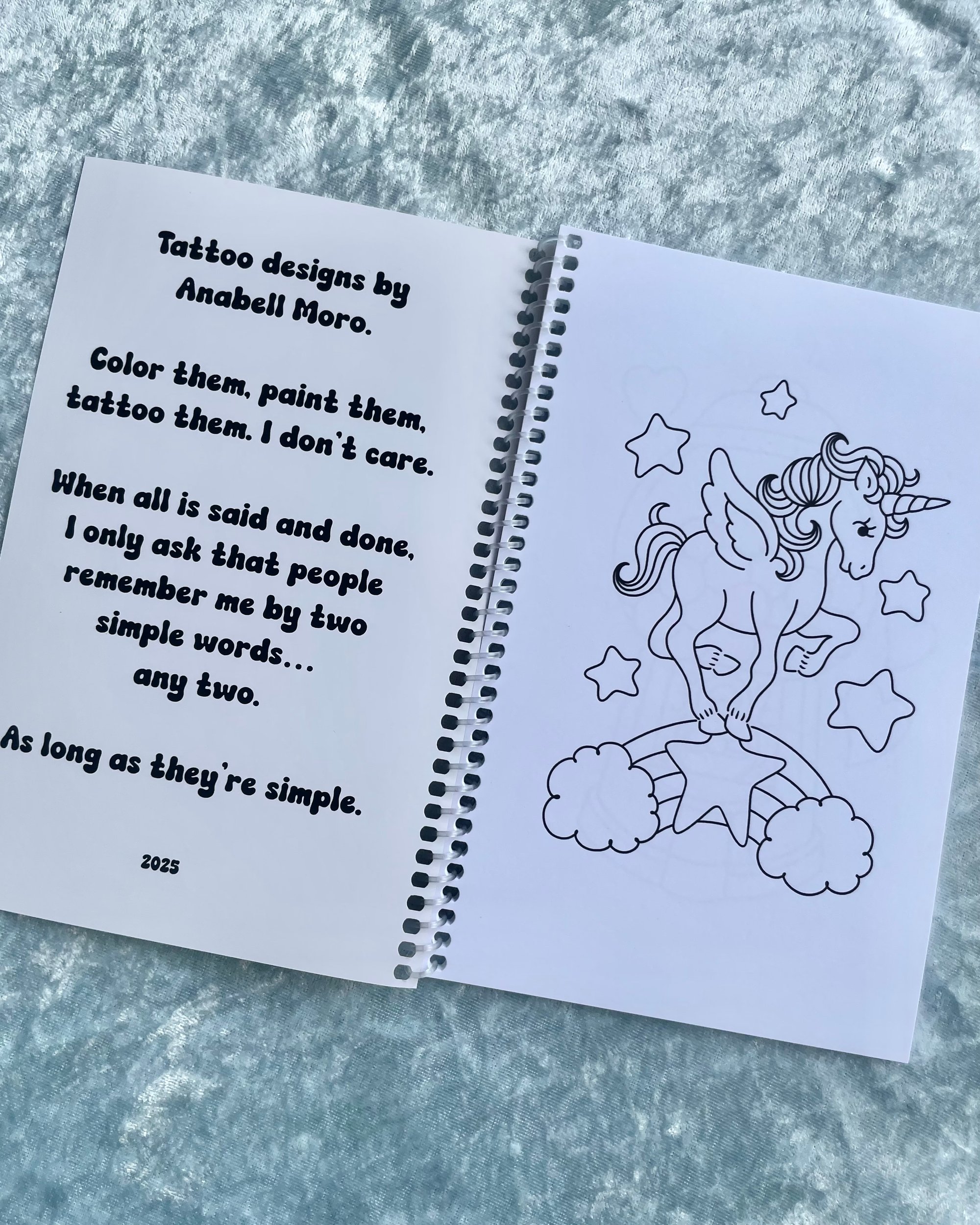 20 pages of tattoo flash designs by me! Color them, paint them, tattoo them, whatever your heart desires. Each book comes with a free crayon box sticker!